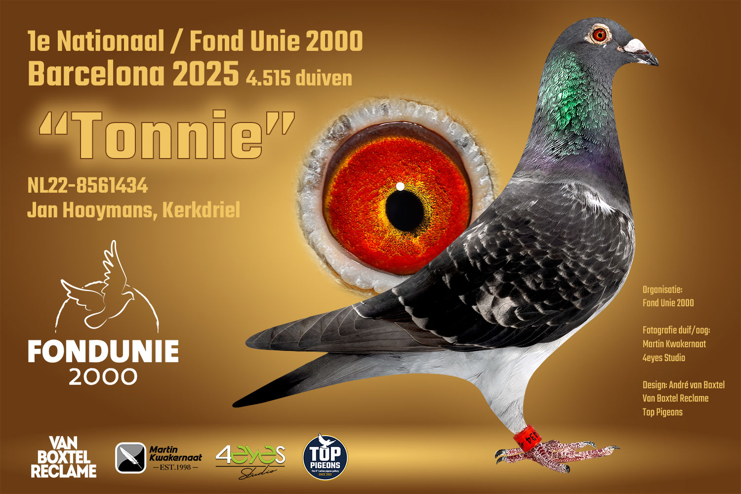 โTONNIEโ draagt de ring NL22-8561434 en is door Jan Hooymans met heel veel waardering en medeleven vernoemd naar de onlangs overleden vrouw van Cor de Heijde. Jan heeft al meer dan 30 jaar een intense vriendschap met Cor de Heijde en het is dan ook bijzonder mooi dat via moederskant de top duiven van Cor terugzien in de pedigree van de winnares van Nationaal Barcelona 2025. De moeder van โTONNIEโ komt uit een kleinzoon van de legendarische โDON MICHELโ maar ook van โDE BORDEAUXโ. En dat zijn twee sterkhouders in de kolonie van Cor de Heijde. Grootmoeder via moederskant is een dochter van een volle zus van โHARRYโ en die zat gekoppeld aan een zoon van de โJONGE WITBUIKโ van Bas Batenburg & Zn.